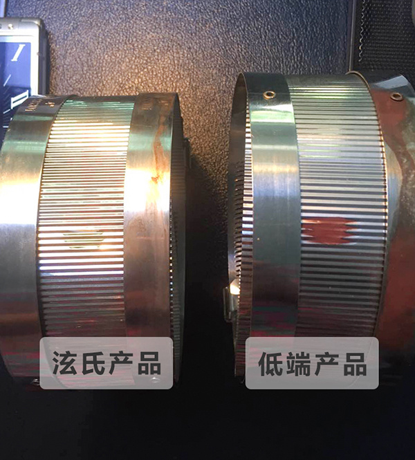 把識別液滴于卡箍任何部位30秒成褐色狀的絕對就是偽劣產品,30秒后成淡紅色的就是301卡箍,不變色為304。一般建議使用301材質,因為301材質不僅硬度要好,而且能滿足抗腐蝕要求。如圖左邊卡箍為301材質,右邊為201材質。